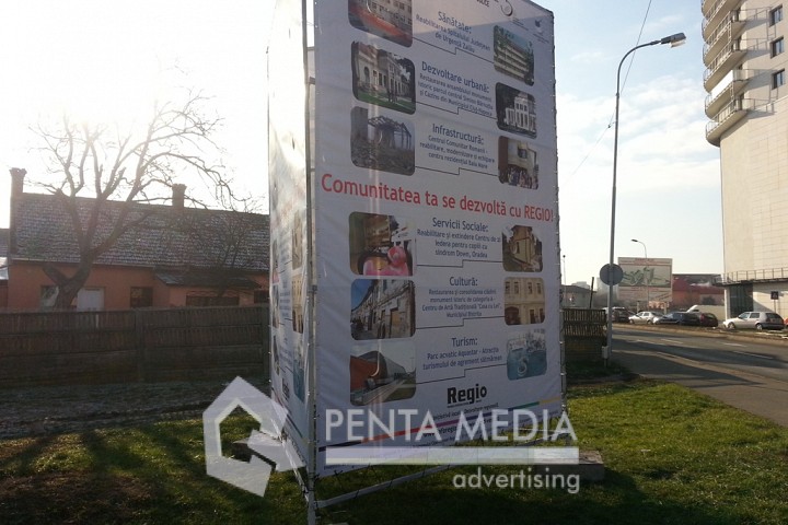 Structura publicitara este alcatuita din module asamblabile prin surburi. Materialul publicitar expus poate fi realizat din material blockout sau frontlit printat, si finisaje cu tivuri si capse perimetrale care sunt ancorate de rama perimetrala.